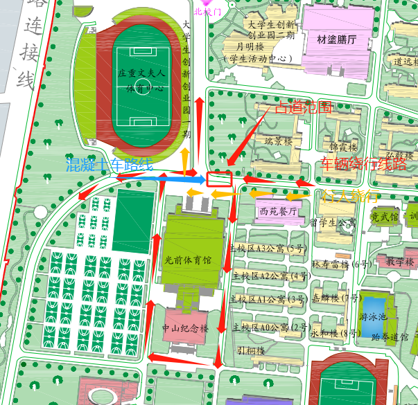 因六社区6#组团学生公寓项目工地围挡内南侧场地狭窄限制,南楼楼层混凝土浇筑作业空间不足,存在安全隐患,因此进行该区域楼层混凝土浇筑施工时需占用光前体育馆北侧部分道路,未来一段时间施工需对该区域道路实行十余次交通管制,请过往师生员工注意现场交通提示。本次交通管制具体如下: