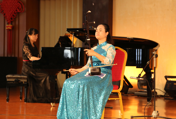茶话会上,我校音乐学院的师生们及共建单位解放军某部文艺队还表演了舞蹈《鼓庆新春》、古筝独奏《枫桥夜泊》、二胡独奏《阳光照耀着塔什库尔干》、女声独唱《江山》等精彩节目。