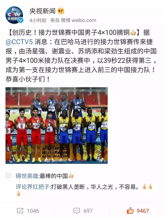 2017年,巴哈马接力世锦赛,参加中国男子4×100米接力队在决赛中,以39秒22获得第三,成为第一支在接力世锦赛上进入前三的中国接力队!