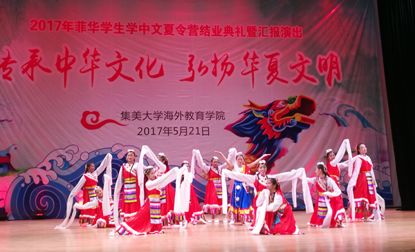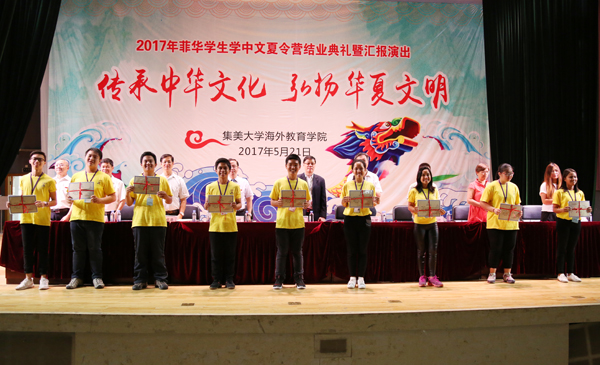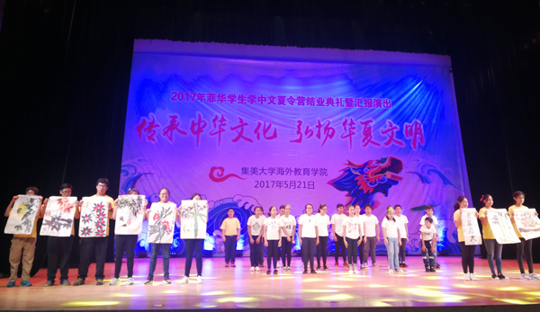 5月21日下午,2017年“中国寻根之旅”——菲律宾华裔学生学中文夏令营结业典礼暨汇报演出在我校古龙大礼堂举行。菲律宾华文教育研究中心主席黄端铭,菲华汉语进修团(集大团)团长郑威廉、副团长倪琼妹、张芳,我校国际合作交流处负责人和海外教育学院有关领导出席了典礼。