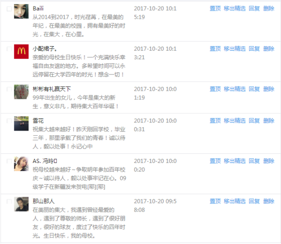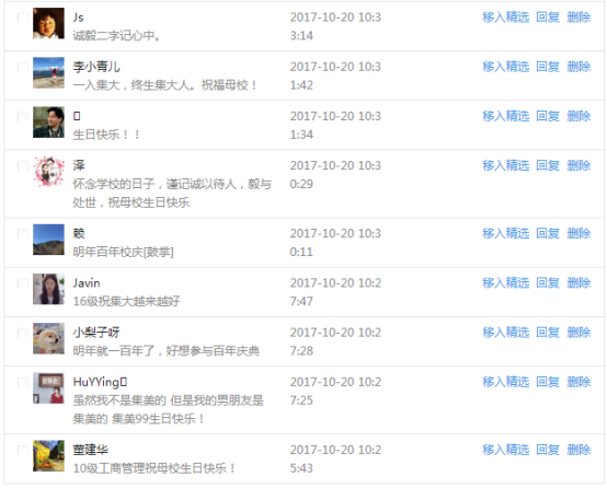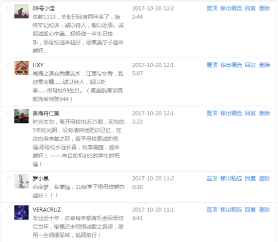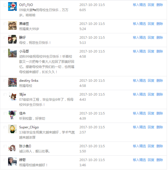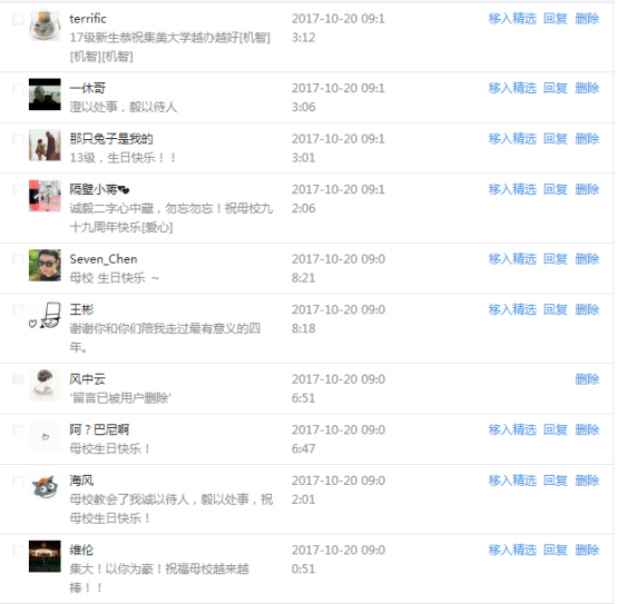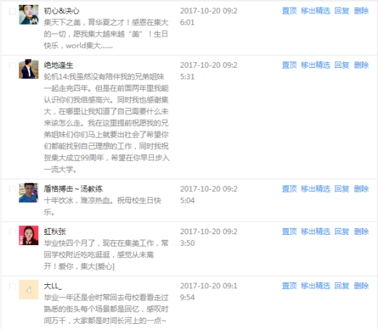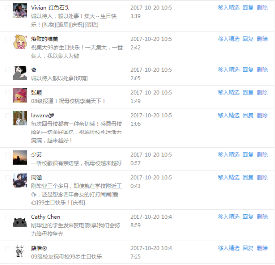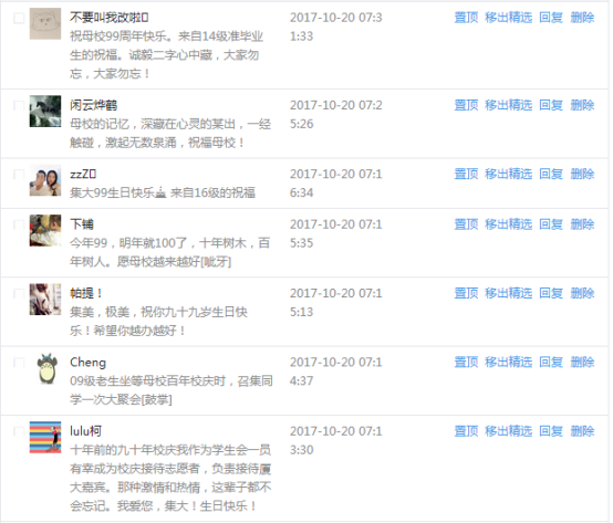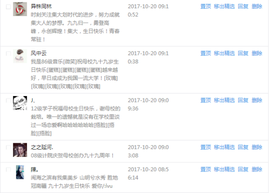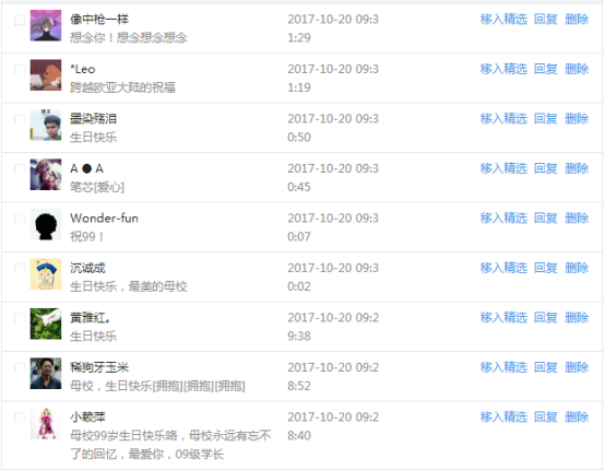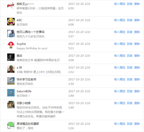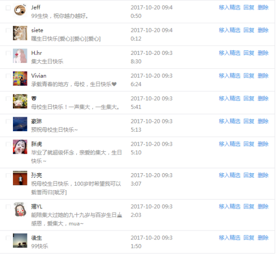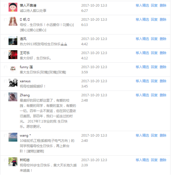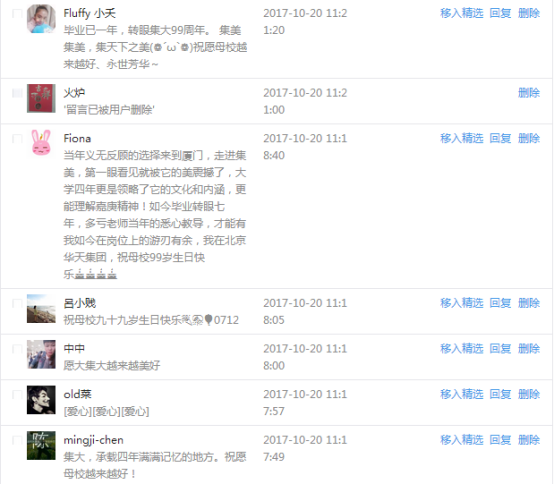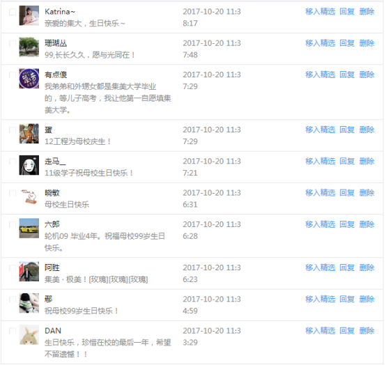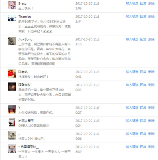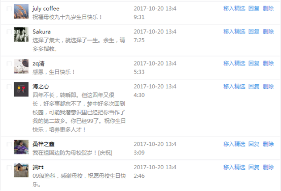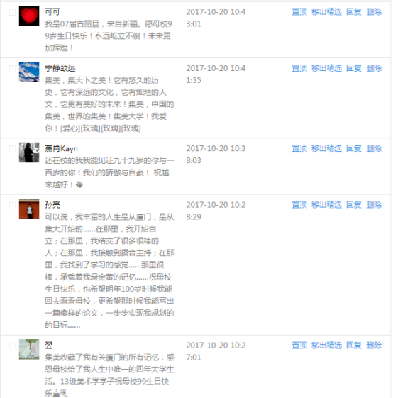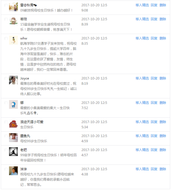 今天是我校建校99周年纪念日,学校官方微博、微信同步推送校庆日专题,得到了海内外各届校友的积极关注,校友纷纷为母校留言点赞,截至发稿时至,微博总浏览量4.9万,留言数76,点赞数222;微信推文总浏览量2.63万,H5祝福专题超过50万人次点赞祝福,微信后台留言数681,点赞数795。海内外校友在留言中表达了对在母校学习生活的时光的怀念,感谢母校的培育,祝福母校生日快乐!希望母校越办越好!