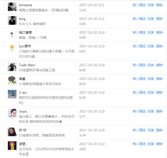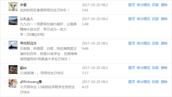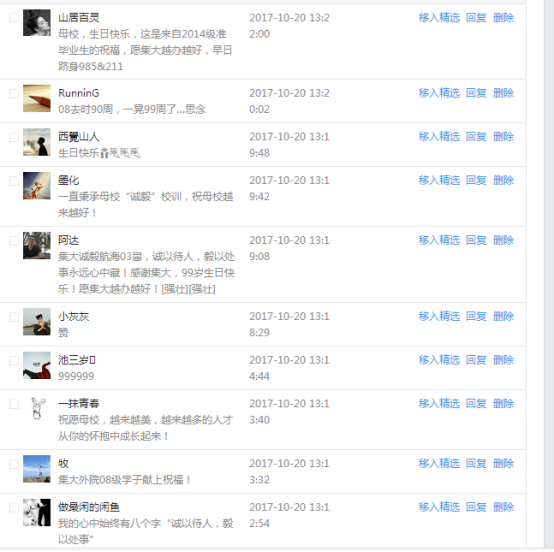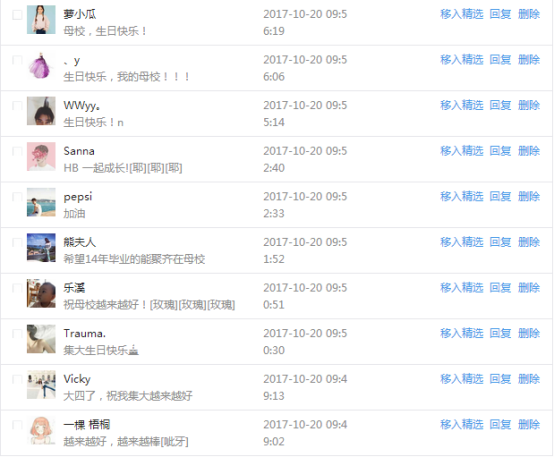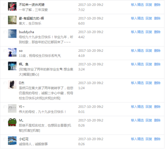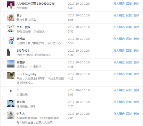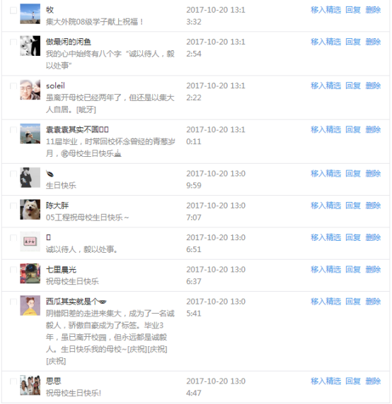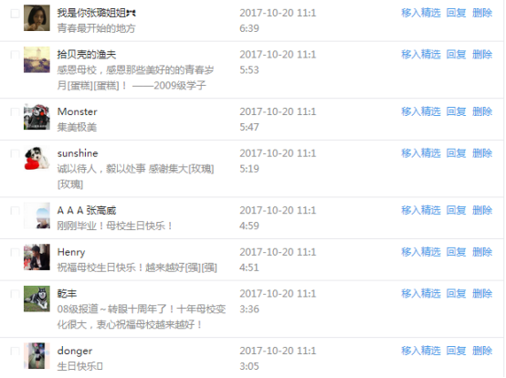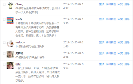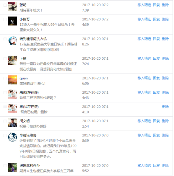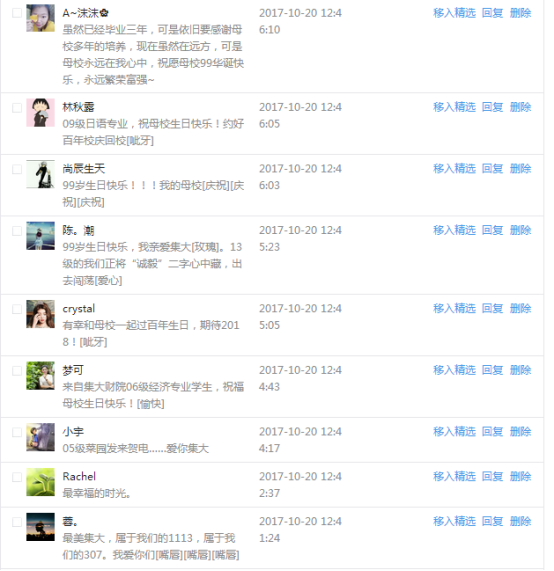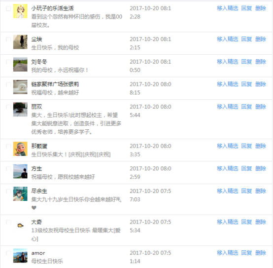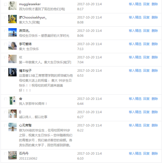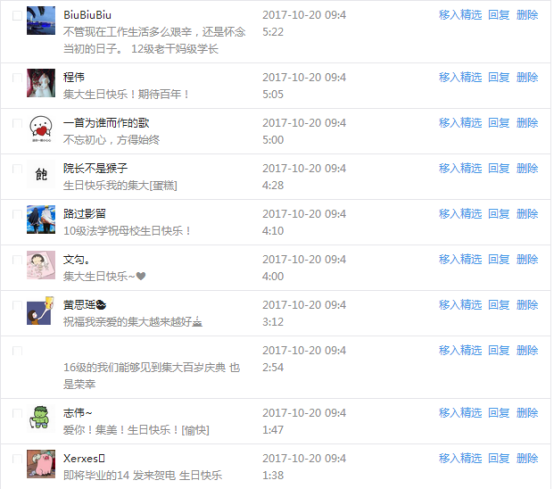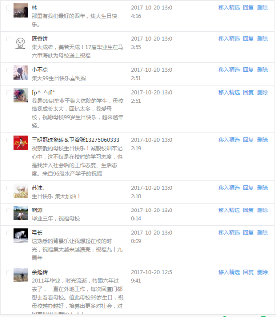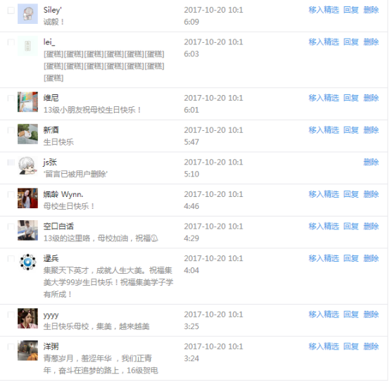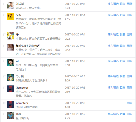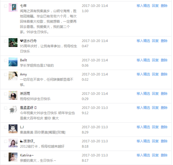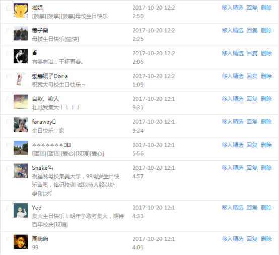 今天是我校建校99周年纪念日,学校官方微博、微信同步推送校庆日专题,得到了海内外各届校友的积极关注,校友纷纷为母校留言点赞,截至发稿时至,微博总浏览量4.9万,留言数76,点赞数222;微信推文总浏览量2.63万,H5祝福专题超过50万人次点赞祝福,微信后台留言数681,点赞数795。海内外校友在留言中表达了对在母校学习生活的时光的怀念,感谢母校的培育,祝福母校生日快乐!希望母校越办越好!