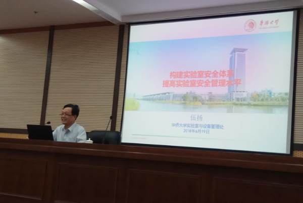 讲座中,伍扬以“构建实验室安全体系,提高实验室安全管理水平”为题,从2017年福建省教育厅组织的实验室安全专项督查中发现的各类安全隐患和问题开始,列举了实验室安全事故的几种常见表现形式,提出了实验室安全的重要性和紧迫性,分析了构建实验室安全体系的组成要素。他还以华侨大学实验室安全体系为例,剖析了实验室安全体系建设的要点和重点,并着重介绍了华侨大学实验室危险化学品安全管理的先进经验和管理措施。