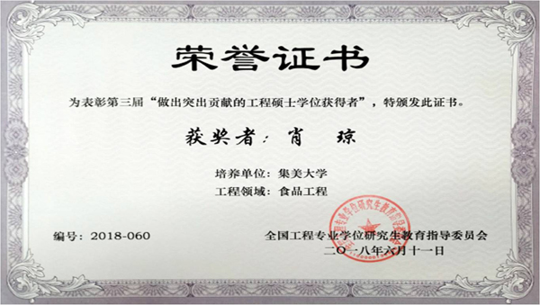 日前,全国工程专业学位研究生教育指导委员会第三届“做出突出贡献的工程硕士学位获得者”评选结果出炉,共有来自全国65所院校的119名工程硕士获此荣誉称号。我校2015届食品工程硕士研究生肖琼名列其中,是我校首次获此荣誉称号的校友。