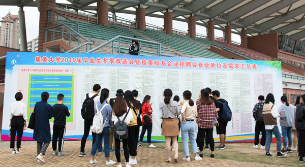 12月5日,我校2019届毕业生冬季双选会暨校董校友企业招聘会在庄重文夫人体育中心举行。福信集团、集友银行、罗普特(厦门)科技集团有限公司等校董校友企业,中国环境保护集团有限公司、福耀玻璃工业集团股份有限公司、招商局物流集团福建有限公司、中国联合网络通信有限公司厦门市分公司等来自省内外的426家企事业单位参会,提供9012个就业岗位。我校及周边院校7000余名毕业生参加了双选会。