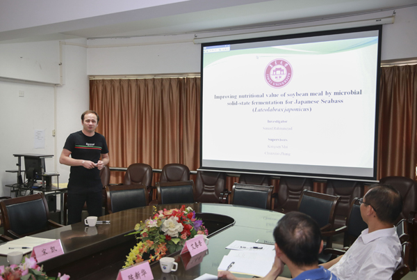 出站考核报告会上,Samad Rahimnejad作了题为“Improving nutritional value of soybean meal by microbial solid-state fermentation for Japanese(Lateolabrax japonicus)”的出站报告,介绍了其课题研究情况。该课题利用短小芽孢杆菌SE5和酵母ZR1,采用固体发酵方式发酵豆粕,研究了发酵豆粕替代鱼粉对花鲈生长、免疫和肠道健康的影响。专家们就报告内容进行了质询、交流、讨论,认为Samad Rahimnejad在站期间圆满地完成了博士后流动站要求的各项科研任务,考核优秀,同意其出站。