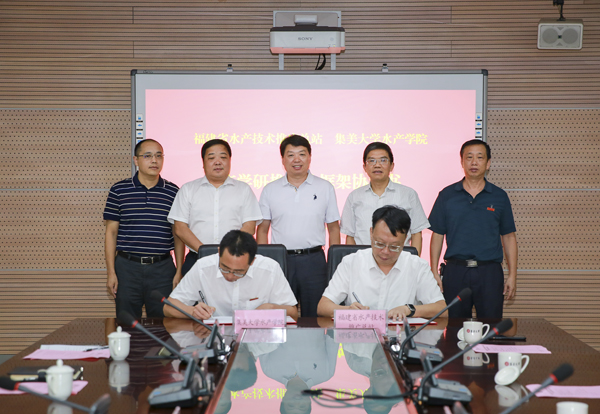 9月20日下午,我校水产学院与福建省水产技术推广总站产学研推合作框架协议签约仪式在尚大楼20楼会议室举行。全国水产技术推广总站党委书记张锋、省海洋与渔业局副局长钟声、省水产技术推广总站站长林竹明,我校校长李清彪、副校长谢潮添出席了仪式;全国水产技术推广总站、省水产技术推广总站、水产学院等相关人员参加了仪式。仪式由谢潮添主持。
