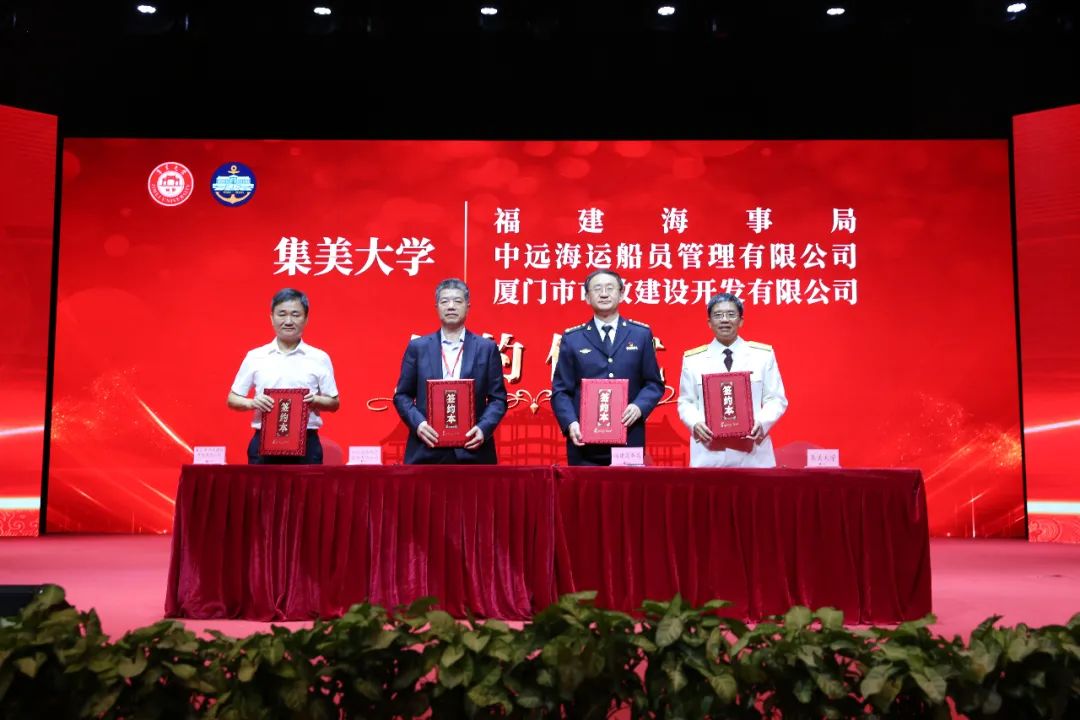 纪念大会上,李清彪代表学校与共建单位福建海事局、中远海运船员管理有限公司、厦门市市政建设开发有限公司负责人签署合作协议,为5个校友会分会代表颁发合作共建荣誉牌匾,为捐赠1000万的校友唐武盛的代表黄镇坤颁发捐赠荣誉牌匾。
