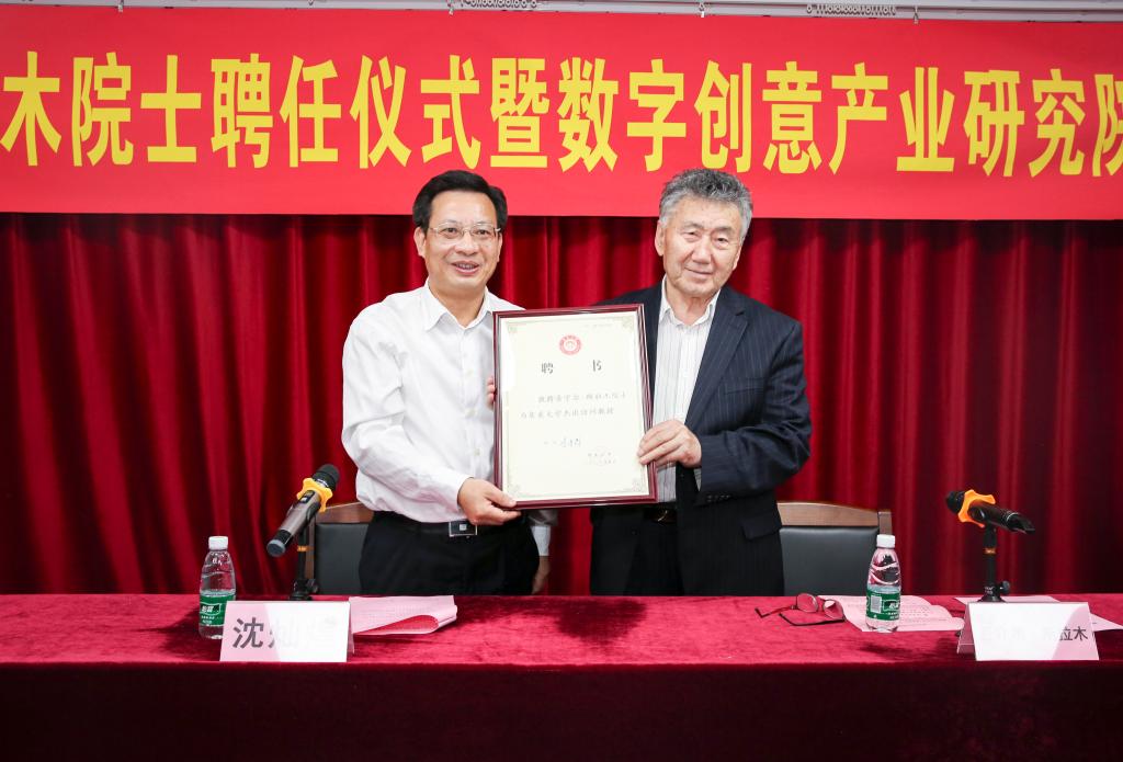 仪式上,沈灿煌和吾守尔•斯拉木院士共同为我校“数字创意产业发展研究院”揭牌。吾守尔•斯拉木院士为数字创意产业发展研究院的执行院长王强、王效杰,常务副院长陈万胜颁发聘书。