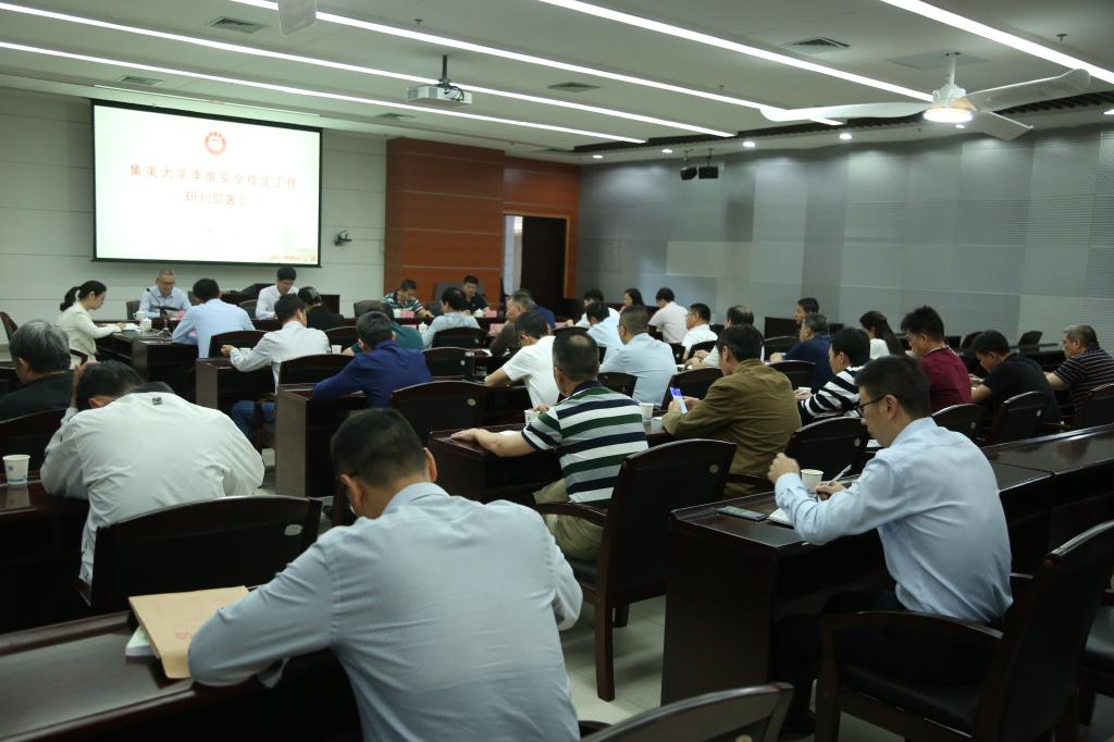 会上,保卫部负责人简要传达了集美区高校安全稳定工作联席会议主要精神,重点就第三季度校园安全稳定工作存在的突出问题以及相关工作建议要求作了通报。各相关职能部门分别就校园意识形态、网络舆情、学生教育管理、疫情防控、实验室安全、食品卫生安全、学生社团管理和后勤保障等方面问题进行了交流研判。会议并就做好学校第四次党代会召开期间校园安全稳定工作作了部署。