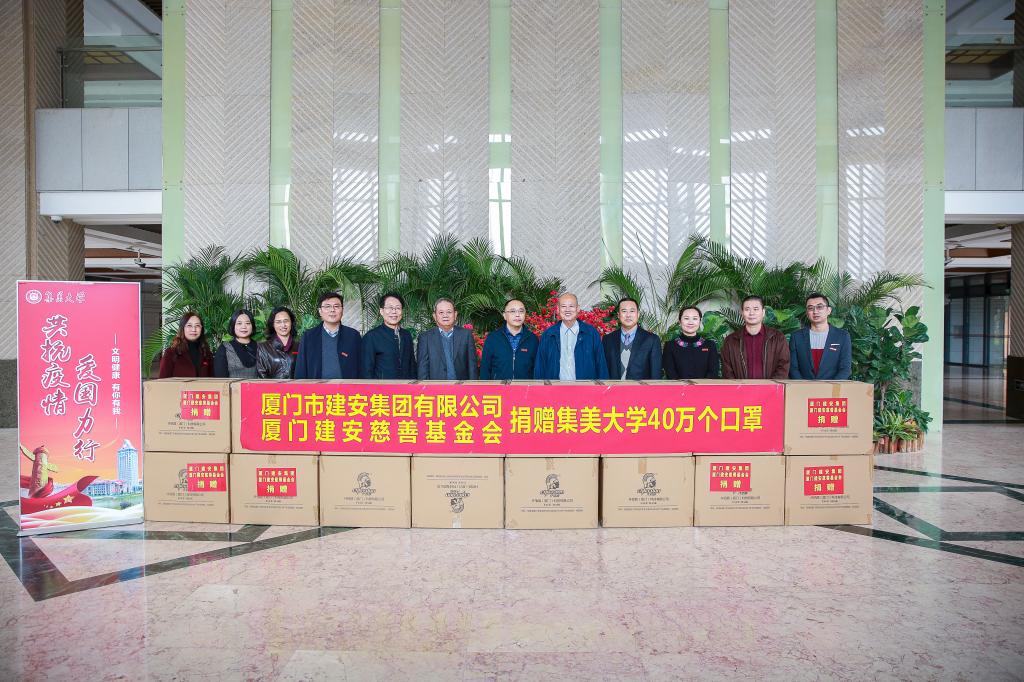 12月15日上午,厦门市建安集团有限公司、厦门建安慈善基金会向我校捐赠40万只爱心口罩,捐赠仪式在尚大楼举行。我校校董、厦门建安慈善基金会理事长孙吉龙,厦门市建安集团董事长孙碧庆,厦门建安集团董事会办公室主任陈荣福,校党委常委、副校长谢潮添,学校办公室、基建与后勤管理处等部门负责人出席捐赠仪式。