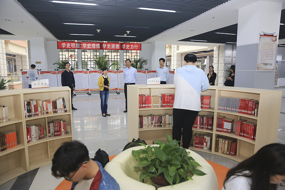 在图书馆,指导组考察了图书馆特设的四史、党史学习专区,并就师生如何提高党史类图书资源的使用率,开展学党史读书交流活动等提出建议;参观“马克思主义传播在中国”文献中的百年党建展、陈嘉庚研究院华侨华人资料中心、特藏图书室等。
