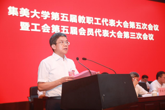 校党委书记沈灿煌在闭幕式上讲话。他充分肯定了学校一年来的工作成就,特别是在学科和专业建设、科研服务、学生创新创业等方面都取得的新突破。他指出,学校正处在深入实施“十四五”规划、加快冲刺全国百强一流大学的关键时期,迫切需要更加广泛地团结凝聚全校教职员工,教代会、工会肩负重大而光荣的使命。他强调,大学章程的修订要把统领地位体现好,准确体现党的主张、学校特色、师生意愿,要发挥章程在学校治理中“总纲领”的作用。他要求,一要坚持党的全面领导,把牢正确政治方向。广大教职工要自觉捍卫“两个确立”,增强“四个意识”、坚定“四个自信”、坚决做到“两个维护”。二要认真实施学校章程,推进一流大学建设。广大教职工要主动融入学校的发展目标,聚焦学科特色方向,积极奋发向上,为“工海”特色更加鲜明的一流大学建设作贡献。三要切实保障师生合法权益,营造和谐发展环境。教代会、工代会代表要常思代表之责、常怀发展之心,发挥好桥梁纽带作用,调动广大教职工努力建设一流大学的积极性。