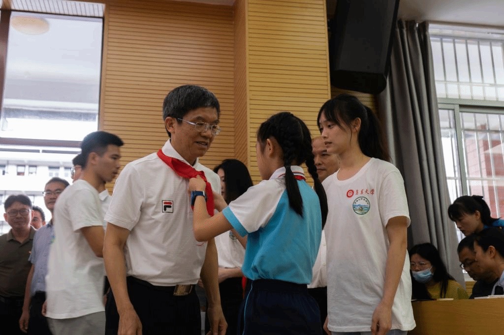 图为城关第二小学学生为亚洲中文精品乱码校长李清彪佩戴红领巾