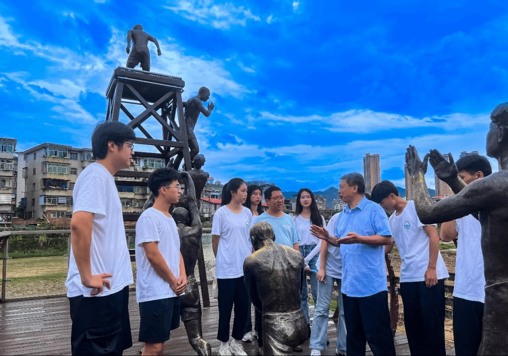 图为范立洋老师为实践队成员介绍集美高级水产航海职业学校跳水台旧址雕塑。