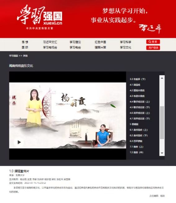近日,我校音乐学院杨丽霞教授开设的《闽南传统音乐文化》课程在学习强国平台“艺术学慕课”栏目上线。