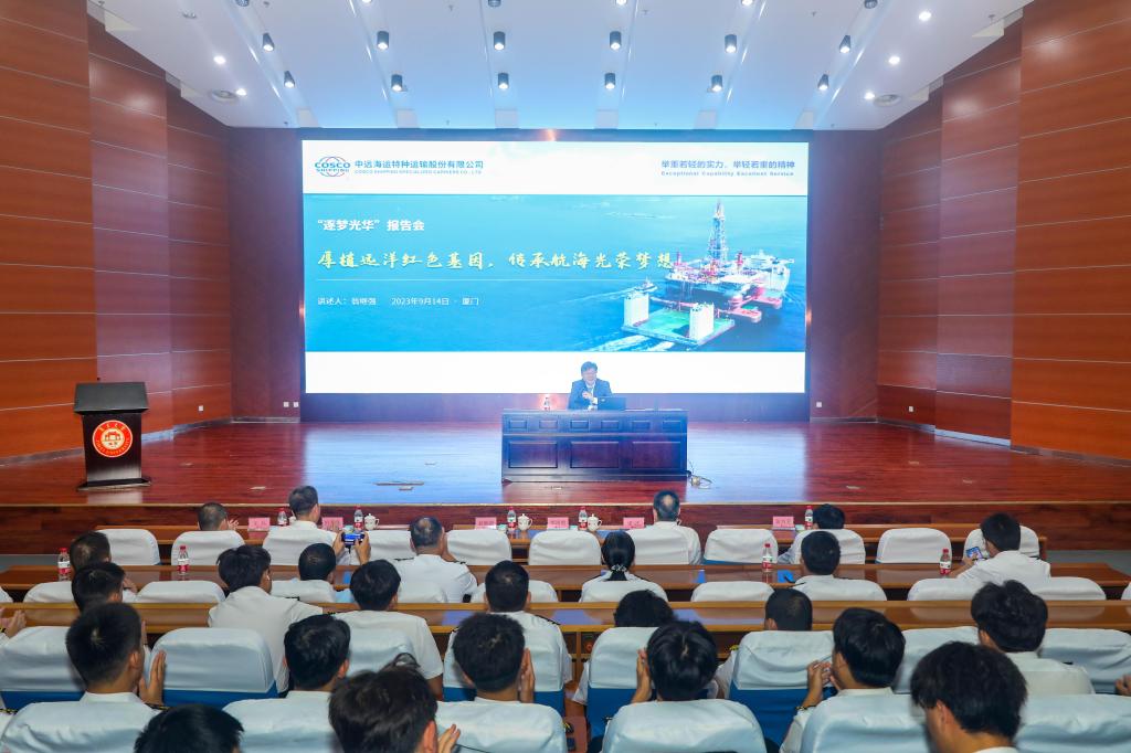 聘任仪式后,翁继强作了题为“厚植远洋红色基因,传承航海光荣梦想”专题报告。他讲述了我国远洋运输事业的发展历程和远洋特种运输老一辈航海人艰苦创业、开拓创新的献身精神,展示了新时代特运人薪火相传、图强报国的爱国精神,为全体参会师生上了一场既生动又深刻的航海思政大课。