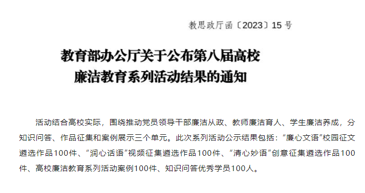 近日,教育部公布第八届高校廉洁教育系列活动结果,我校纪委(监察专员办)撰写的《牢记习近平总书记嘱托,弘扬嘉庚精神,推动陈嘉庚廉洁思想创造性转化、创新性发展》入选案例展示优秀作品。