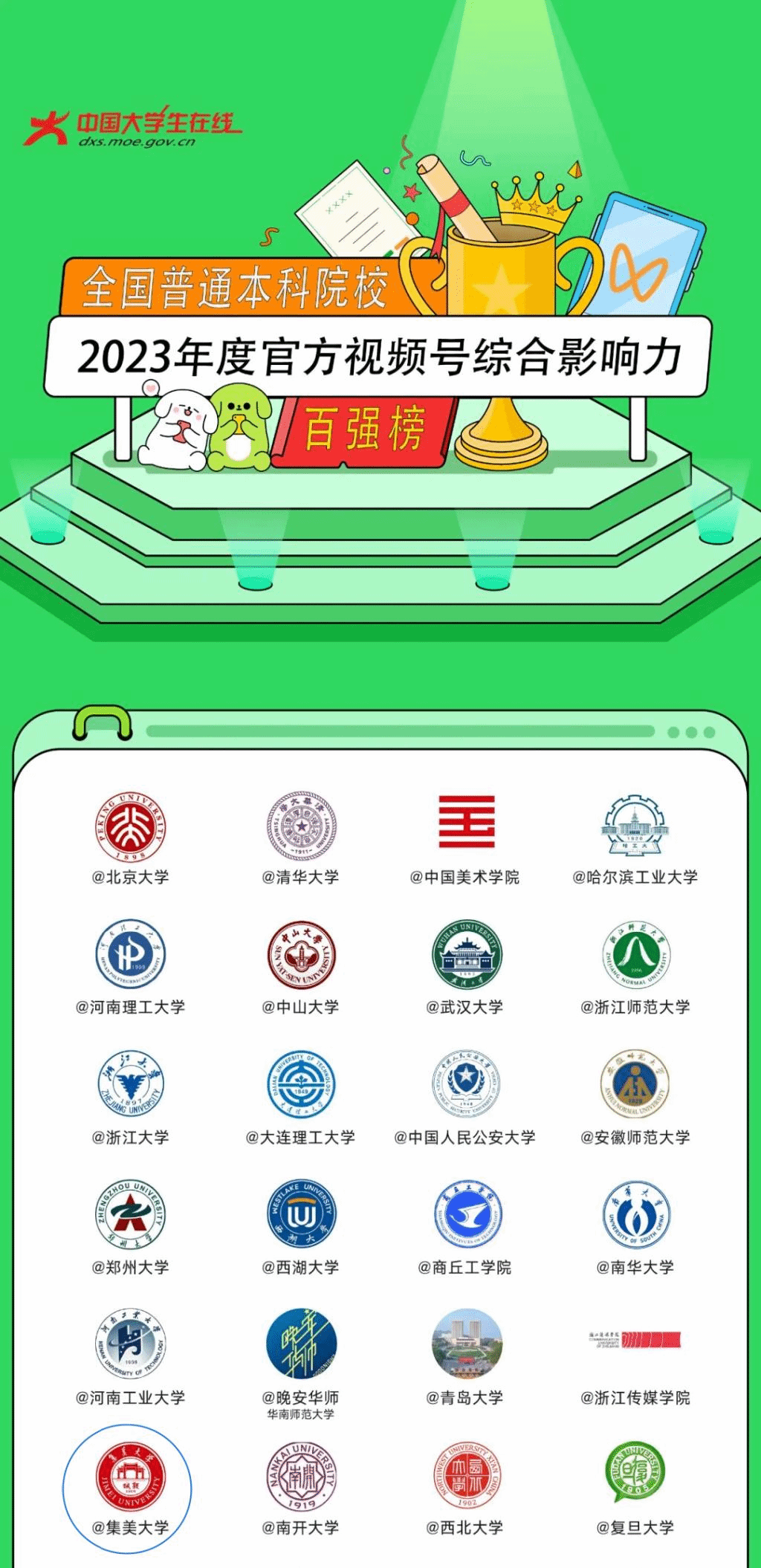 日前,教育部中国大学生在线联合微信官方发布“全国普通本科院校2023年度官方视频号综合影响力百强榜”,我校官方视频号跻身榜单前列,位列第21名。