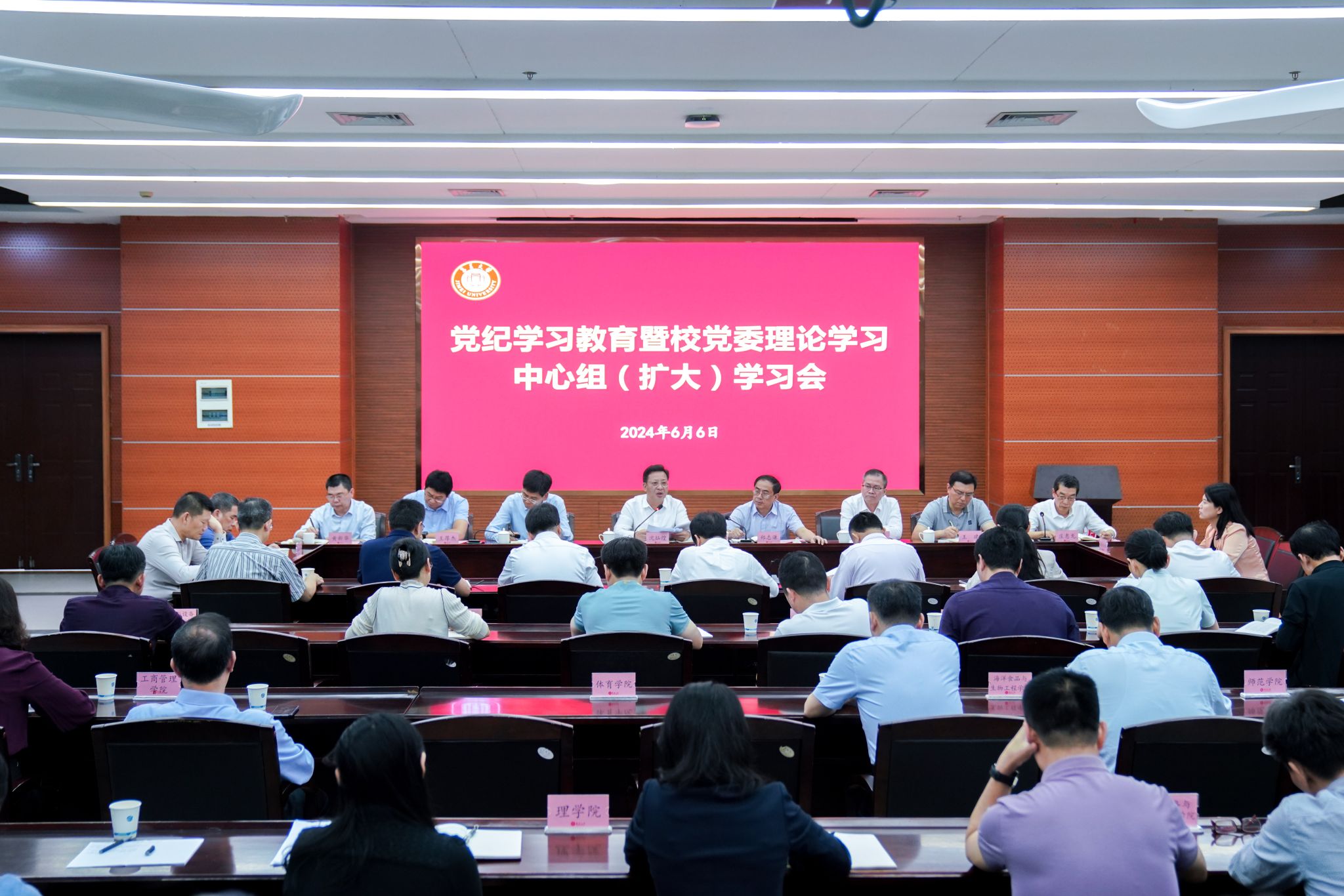 6月6日下午,我校召开党纪学习教育暨校党委理论学习中心组(扩大)学习会第四次集中专题学习。校党委理论学习中心组成员,校纪委委员,机关部处和教辅机构主要负责人,各学院党委书记、院长(含主持工作副院长)参会。会议由校党委书记沈灿煌主持。
