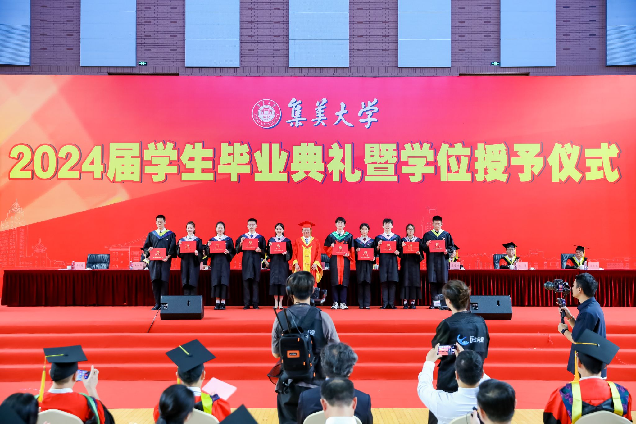典礼在庄严的国歌声中拉开序幕。校党委书记沈灿煌为2024届优秀毕业生代表颁发荣誉证书,全体校领导为毕业生代表颁发毕业证书。
