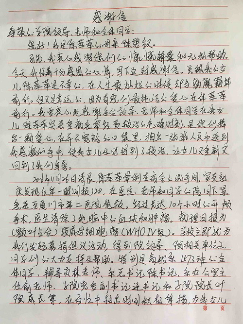 此前,学院领导、师生、校友、社会各界人士通过多种渠道传递爱心接力、慷慨解囊,共为陈萃萃募集善款35万余元,为陈萃萃的治疗提供了有力资金保证。对学院领导和学院师生、校友、社会各界人士一直以来对陈萃萃的关怀、支持和善举,陈萃萃父亲、母亲非常感动,并于1月10日特地送来一封感谢信(附后)。