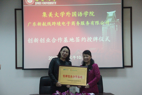 3月31日上午,外国语学院与广东新航线跨境电子商务服务有限公司举行共建创新创业合作基地签约授牌仪式。学院负责人,商务英语系、团委老师和广东新航线跨境电子商务服务有限公司总经理孙媛等参加了仪式。