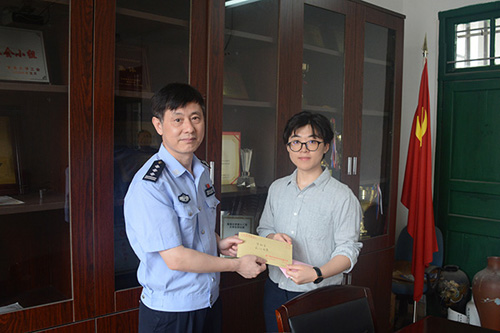 4月19日上午,厦门市公安局公共交通分局情报指挥中心负责人杨日水一行来到财经学院,送来该分局的一封表扬信和2000元奖金。