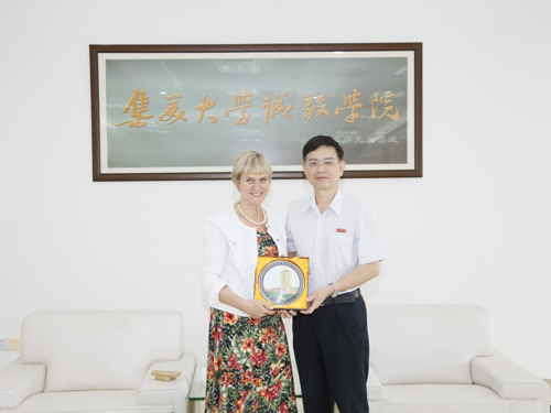 6月19日,澳大利亚莫道克大学(Murdoch University)副校长Lyn Karstadt教授及新加坡Kaplan高等教育学院校长Leon Choong一行来我校诚毅学院访问。诚毅学院院长叶光煌会见了来访客人并与其座谈,学院对外交流合作部主任兼国际学院院长等相关人员陪同座谈交流。
