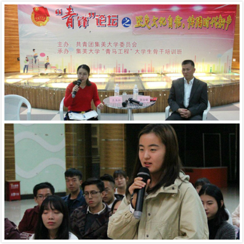 近日,我校在月明楼多功能厅举办“青锋论坛”之“坚定文化自信 传播时代新声”论坛活动。校“青马工程”第六期大学生骨干培训班学员和校团委老师参加了论坛活动。
