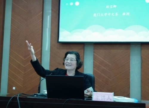 讲座中,林宝卿讲述了闽南语的历史源流、发展以及在现实生活中的应用等方面内容。她指出,闽南方言是古汉语的活化石,历史悠久,有其独特魅力和特有的文化;并希望同学们能够热爱、传承闽南文化。