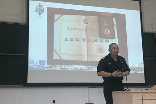 报告中,陈海阳以“家门 校门 警门”为题,分享了自己家庭教育、学校培养以及工作经历;讲述了自己从警21年来,凭着对党的忠诚和对人民群众的爱,保一方平安,在平凡的岗位上书写了不平凡的成长经历。他以自身的经历勉励同学们,在校要好好掌握专业知识,多参加社团活动,丰富自己的阅历,为走上社会打下坚实的基础。