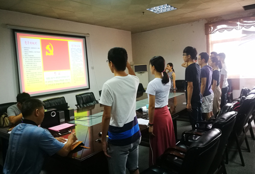 仪式上,在领誓人的带领下,学院全体新老党员面对着神圣的中国共产党党旗,进行庄严宣誓。