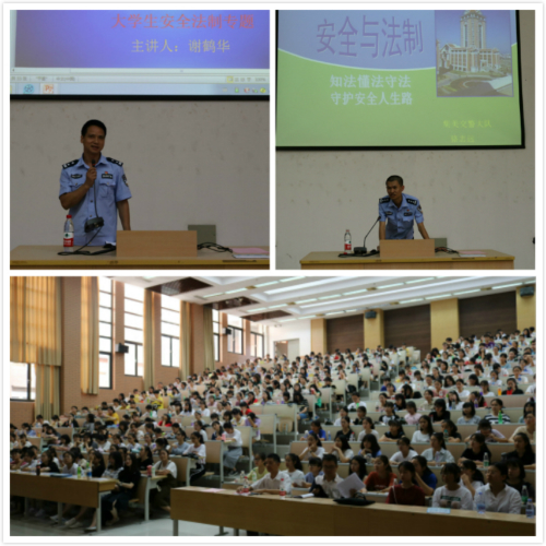 谢鹤华以“大学生安全法制”为主题,介绍了学村派出所的警情情况,用数量警醒学生重视安全问题;通过案例介绍、视频观看等方式列举了学生上当受骗的“经典”骗术;对大学生财务被盗的频发地点进行了分析,详细讲解如何防盗;还重点强调了校园贷、毒品、打架斗殴等事件可能导致的严重后果,为同学们普及了丰富的法制知识。骆志远以“交通安全”为主题,讲解了《中华人民共和国道路交通安全法》,列举了学生醉驾事故及相关交通事故案例并分析原因,让学生意识到交通安全的重要性。