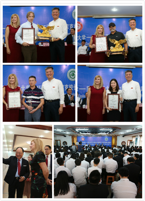 美国库克大学校长Amy Storey致辞,对我校百年华诞表达了真挚的祝福,对前任校长贺睿拉博士任职七年间为推进两校合作所做的一切表示感谢,期待两校之间的伙伴关系长期保持并得以发展,并为项目办学十五年所取得的成绩与校友们的优秀表现感到骄傲。她还宣布,库克大学董事会为肯定和感谢黄天中博士在生涯规划体验式学习教育领域的教学和成就,将于2019年1月提名黄天中博士接受美国国家体验式学习联盟颁发的“高等教育体验式学习杰出成就奖”,以表达库克大学对黄天中博士在生涯规划和体验式学习领域的长期付出和重大贡献的感谢。