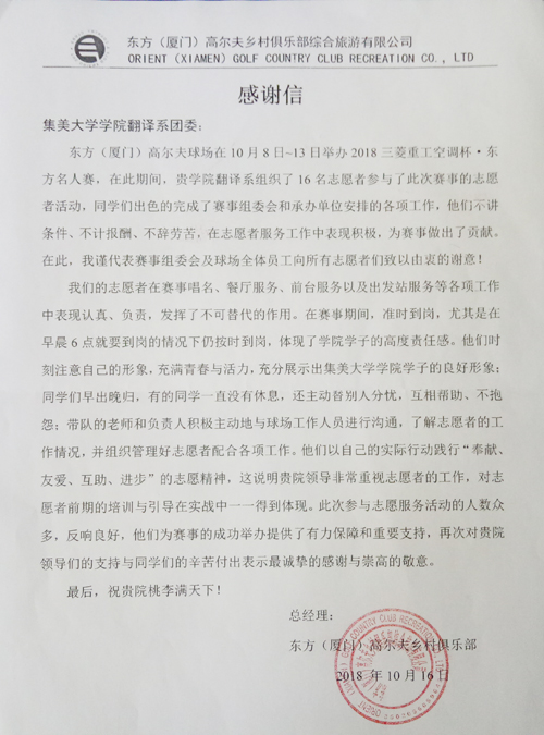 近日,外国语学院选拔组织的10名翻译志愿者参加了由东方(厦门)高尔夫球场举办的“2018三菱重工杯·东方名人赛”志愿服务工作,认真完成了赛事组委会和承办单位安排的各项工作,为赛事的成功举办提供了有力保障和重要支持。