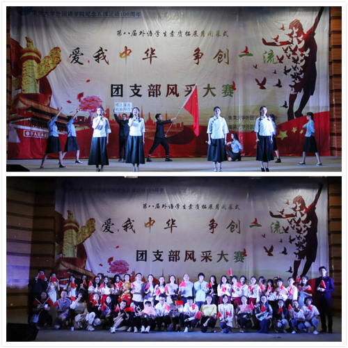 近日,外国语学院在月明楼报告厅举行第八届外语学生素质拓展月闭幕式暨“爱我中华,争创一流”纪念五四运动100周年团支部风采大赛。学院党委书记杨龙美、党委副书记陈雅珍、团委负责人,各年级辅导员及班主任、全院学生观看了比赛。