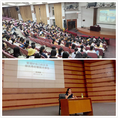 学院党委副书记林芙蓉做“管理好自己的大学,做合格的大学生”的讲座。讲座中,她强调,作为学院学生,应该发挥专业优势,提高自我管理能力,将嘉庚精神融入到实际学习生活中,做到知行合一,为学校冲刺一流大学做贡献。