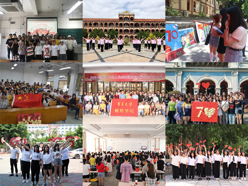 学院在尚忠楼前举行升旗仪式,录制“歌唱祖国”快闪视频,举办“我与祖国共奋进——国旗下的演讲”特别主题团日活动,通过国歌奏唱、国旗下演讲、嘉庚语录诵读、字样献礼等形式献礼新中国成立70周年。学院学生会、自律会及各系学生代表在财苑食堂、尚忠楼举行“我为祖国送祝福”快闪表演活动,扇子舞、红歌演唱、八女投江话剧等一系列表演,将革命精神与爱国情怀展现得淋漓尽致。学院各班级以录制视频、手写祝福、唱响国歌、主题海报设计等形式开展“我与祖国共奋进,我与集大同成长”主题团日活动。