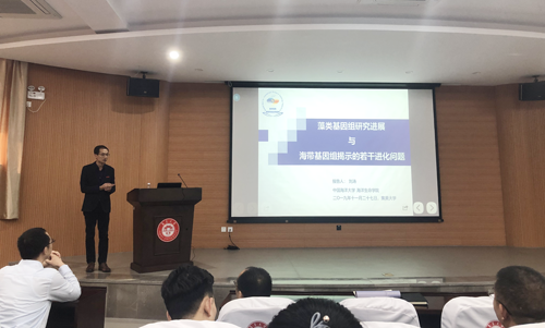 聘任仪式后,刘涛还做客水产学院水产前沿讲坛,为学院师生作了题为“藻类基因组研究进展与海带基因组揭示的若干进化问题”的学术报告,介绍了藻类基因组的研究进展、藻类基因组揭示的基本遗传学问题、海带核心代谢通路及其反映的进化机制,并就藻类基因组研究的热点问题及挑战进行了总结与展望。
