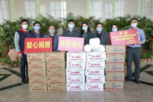 2月28日,学院2016级学生党员郭梓航、黄思婷在得知学校防疫物资紧缺的情况后,通过各种渠道采购,第一时间捐赠600瓶(500ml/瓶)消毒液(金星、84)、120瓶(500ml/瓶)免洗洗手液(适净)、850个一次性口罩等防疫物资,助力母校战“疫”。