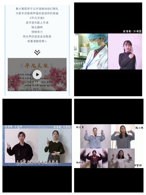 本次活动以歌手邓紫棋声援抗疫创作的歌曲《平凡天使》为素材,依据歌词录制手语操视频,并利用学院微信公众号平台进行宣传。该活动推文视频一经推出,学院学子纷纷转发和留言,对疫情期间勇敢“逆行”的白衣天使表示敬佩与感激,同时表达了期盼疫情早日结束、共同相聚校园的愿望。