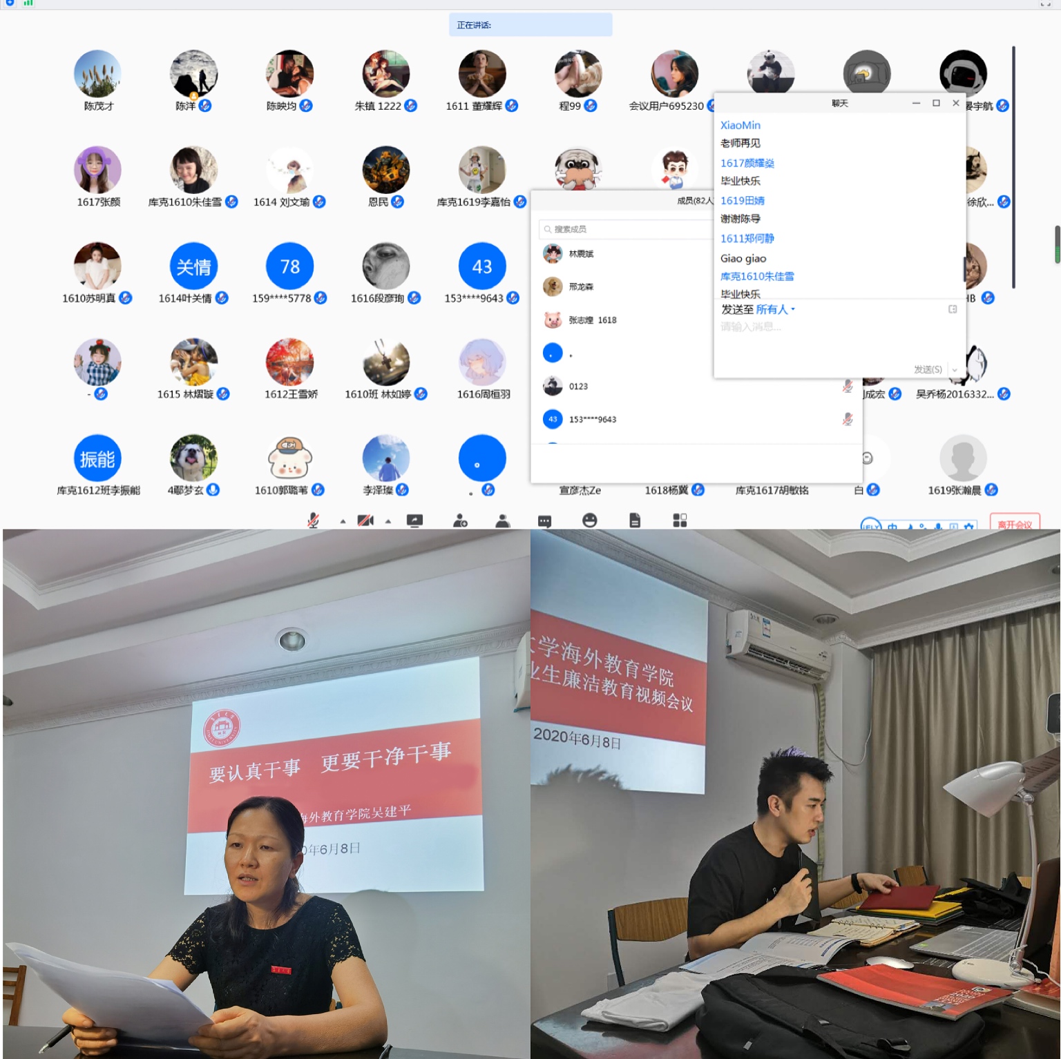 6月8日晚,海外教育学院召开2020届毕业生廉洁教育会议,会议采用腾讯会议线上与线下相结合的方式进行,中美合作库克项目2020届全体毕业生参加。会议由学院党委副书记陈茂才主持。