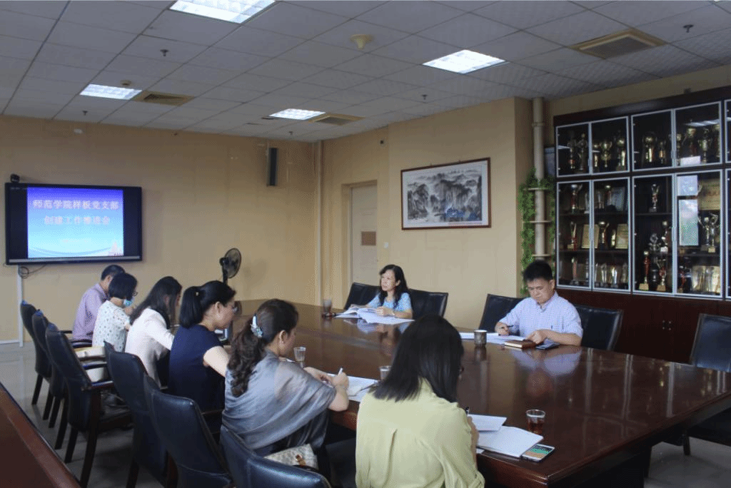 9月10日上午,师范学院召开样板党支部创建工作推进会。院党委书记王娟、副书记郑秀坤、党委组织员、教工第一党支部和教工第二党支部支委参加了会议。