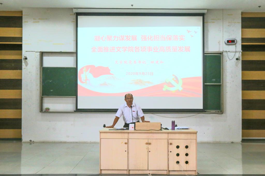会上,田建和作了《凝心聚力谋发展,强化担当保落实,全面推进文学院各项事业高质量发展》的工作报告。会议总结了五年来文学院党委的工作与主要成绩,提出了今后五年的目标任务和对策举措;同时,会议号召全院师生要认真学习贯彻习近平新时代中国特色社会主义思想,落实校党委的各项决策部署,拿出百倍的精神和千倍的努力,为学院建设再创佳绩,再立新功。