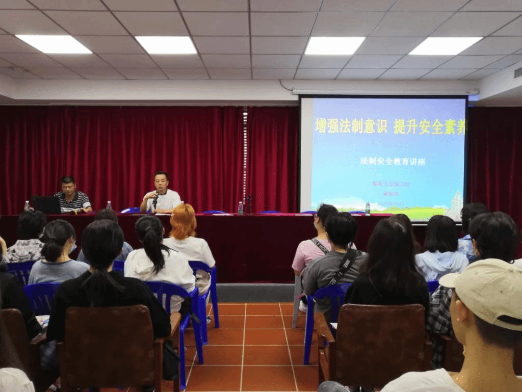 讲座中,董振寿从年初以来备受关注的疫情防控工作讲起,给新生讲解了新型冠状病毒感染的症状和就医常识,讲解校园疫情防控基本要求,提醒同学们要听从学校安排,注重疫情防控,在确保防控安全的前提下努力学习。董振寿还以“增强法治意识,提升安全素养”为主题,结合大量的真实案例和视频材料介绍了校园及周边环境、大学生与法、安全防范知识等三个方面内容,让新生了解校园安全防范知识,提高防范意识。