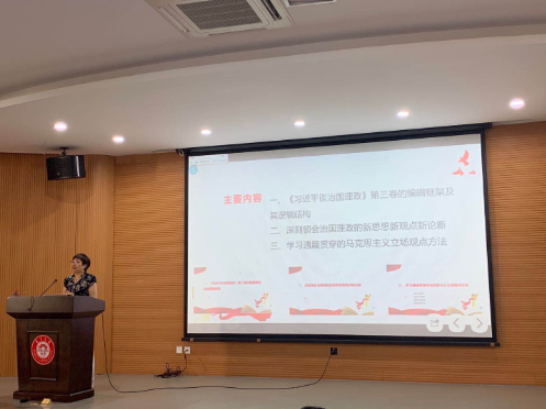 近日,轮机工程学院在水新综合楼报告厅举行《习近平谈治国理政》第三卷专题讲座,邀请马克思主义学院李晋玲教授以《学思用贯通 知信行统一》为题作专题辅导。会议由学院党委副书记赖龙荣主持,全院教职工和研究生党支部全体党员参加学习。