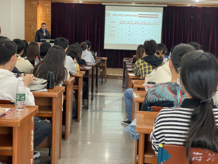 学院负责就业指导教师介绍了学院近三年来成功考取国内研究生的毕业生个案,建议2018级学生早日确定考研目标,认真科学备考,积极提升学历,为未来就业积累更扎实的专业学识和理论基础。 2018级辅导员也结合个人考研经验,对硕士研究生考试的备考注意事项、专业选择以及志愿填报进行了详细说明。