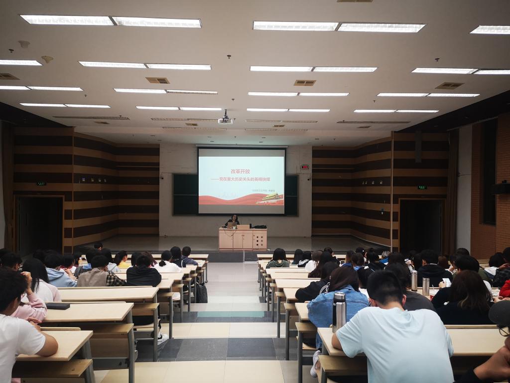 马克思主义学院余碧岩副教授以“改革开放——党在最大历史关头的英明决定”为题,从改革开放的历史背景切入,用一个个生动的故事从农村的家庭联产承包责任制试点开展,讲到城市的国营企业自主经营权明显改善;并以梁小斌的诗集《中国,我的钥匙丢了》为引子,介绍了改革开放的必要性。强调改革开放是在中国共产党领导下所取得的重大成就之一,也是中国走向繁荣富强,中华民族伟大复兴的重要环节。