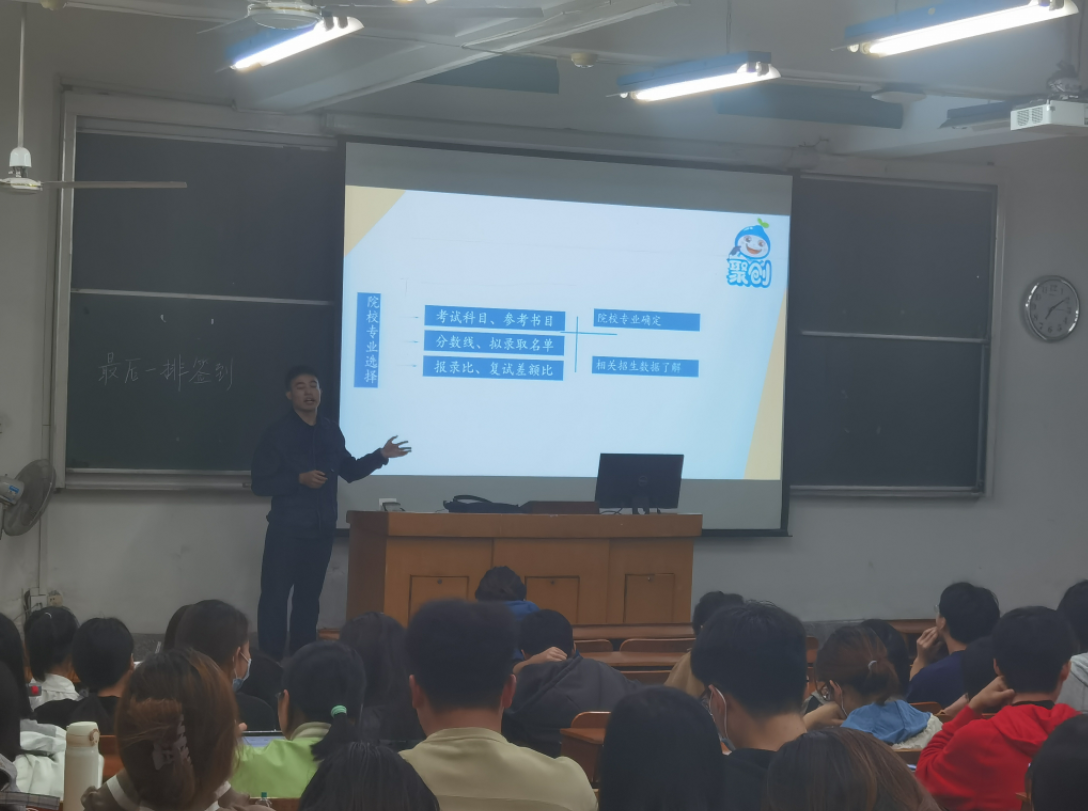 活动现场,主讲老师廖志高围绕对考研流程的知识普及,考研各阶段复习推荐,对常考院校的专业推荐和数据分析,专业课资料收集渠道,以及跨专业考研推荐等内容进行深入讲解,为考研学子提升了信心,助力学院进一步提升考研指导服务水平。